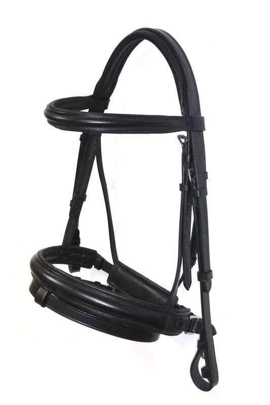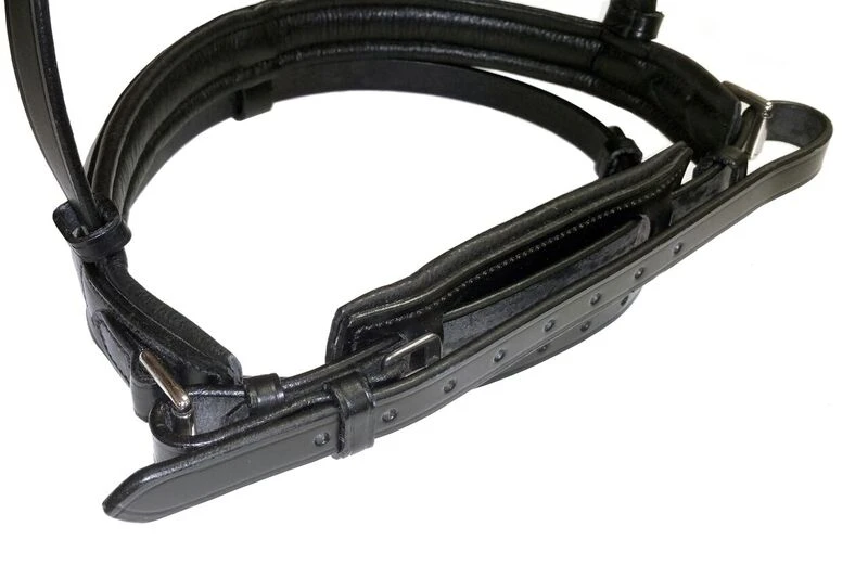 It has a comfort padded head piece, browband and noseband. The noseband is crank style, with two shorter buckled side straps, as the head piece has cheek and noseband straps each side. This eliminates the need for an over the head strap and helps avoid poll pressure. It also makes the bridle more balanced with even pull each side. The crank flash noseband has roller buckles each side and a padded chin pad; this makes it easier to tighten and more comfortable for the horse.