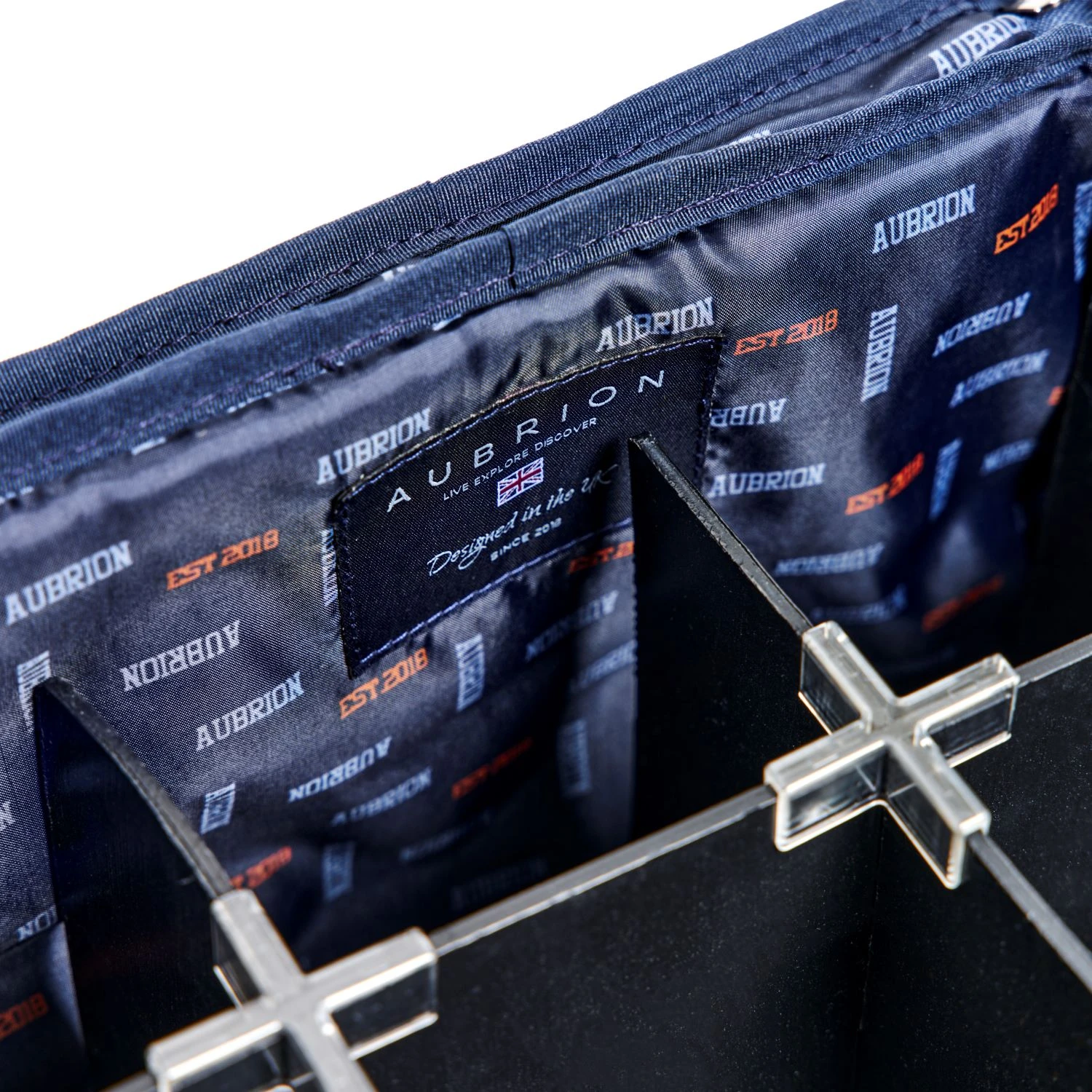 The Aubrion Equipt grooming kit bag keeps your kit organised and easy to access. The zip opening bag features an inner eight part divider, ideal for transporting bottles and keeping everything quick to find. A mesh ventilation panel keeps the air flowing for freshness. Further detail: two padded handles, hardwearing feet, Aubrion prints. Dimensions: W.34cm, D.15cm, H.26cm. Part of the smart Aubrion Equipt luggage range.