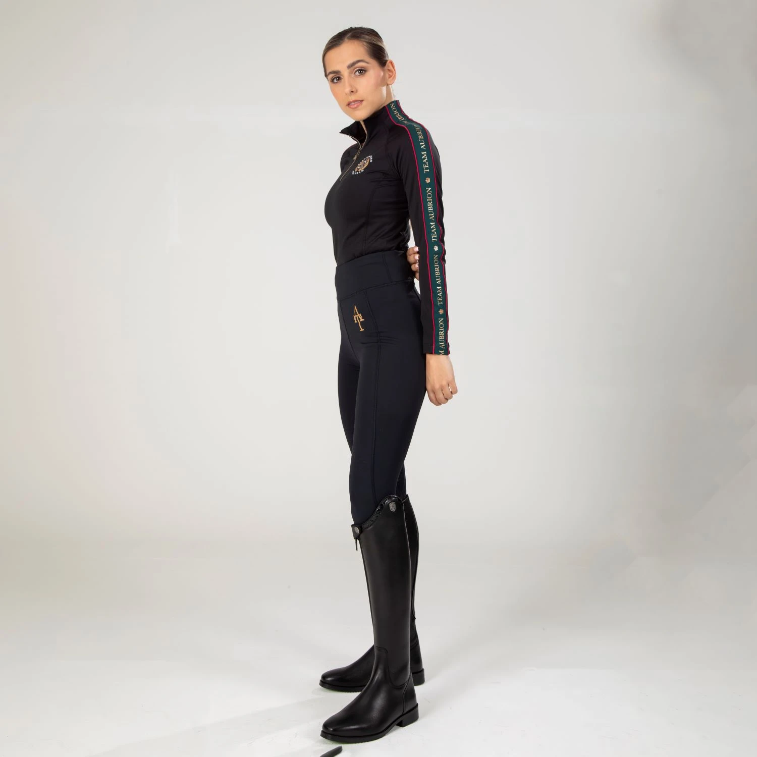 Blending luxurious equestrian style with practical comfort, the winter long sleeve base layer gives Aubrion Team glamour. Designed for any team player, the brushed back stretch fabric works to keep you cosy when the temperature drops and wicks sweat away from the skin for comfort. The high neck and zip opening offer flexible wear options as you warm up. The detail: moisture management, thermal insulating fabric, fitted shape, flatlock seams, Aubrion Team prints.