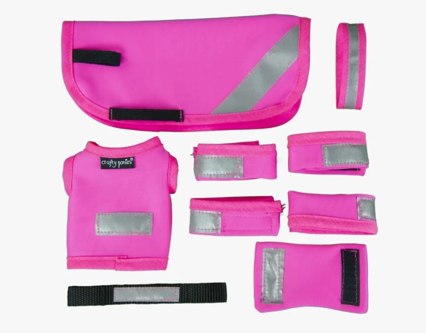 A Crafty Pony Hi Viz set which includes a high visibility browband, leg wraps, hat band, tabard, exercise sheet, tail guard and Crafty Pony instructional booklet!