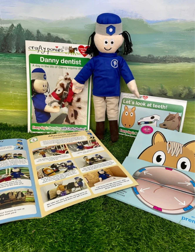 Danny the dentist doll comes with a fully illustrated ‘A day in the life of Danny dentist’ educational story book. Also included is an illustrated ‘Teeth’ booklet, this A5 booklet illustrates ponies teeth at different ages from foal to fully mature. It needs a few minutes of folding and sticking to make the ‘pop-up’ pages and then it’s ready to help children to learn about ponies teeth in a fun new way!
