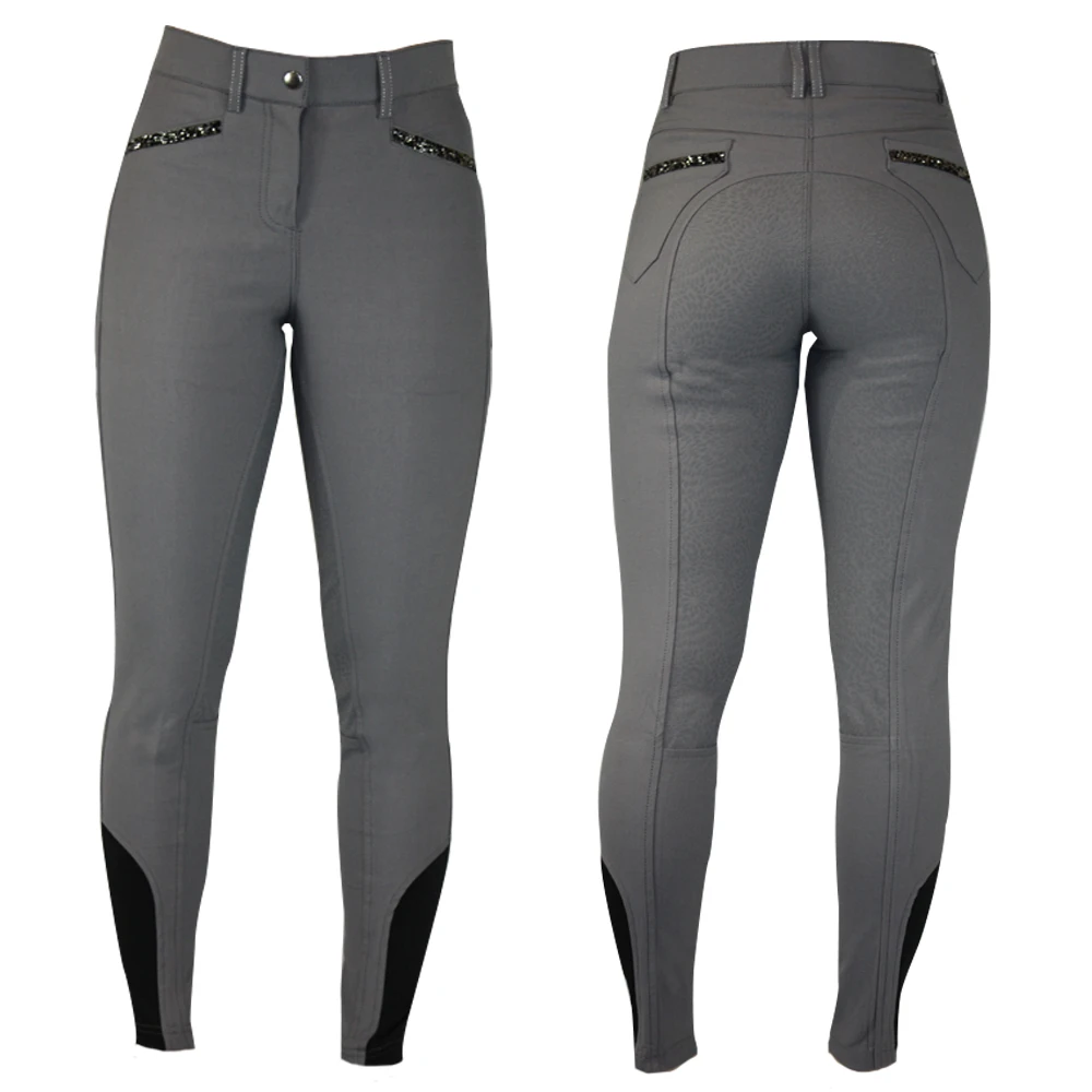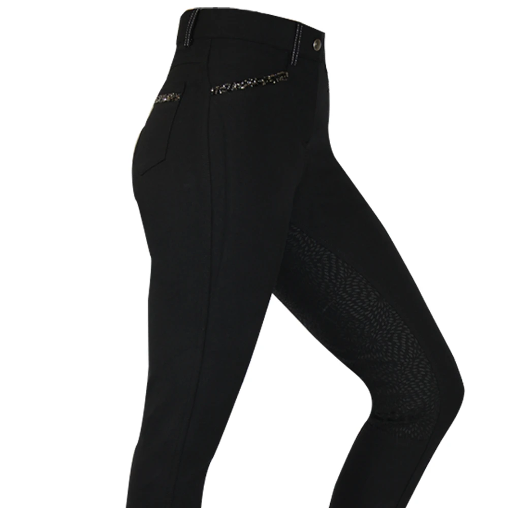 The elegant Ava Breeches have been designed with a breathable stretch material to give you the ultimate comfort whilst riding and general yard duties. Full silicone seat to help keep you in the saddle. Front and back pockets with a silver sparkle detail to give you the subtle but bling look. Elasticated ankles so they do not bunch up in your riding boots for the ultimate comfort.