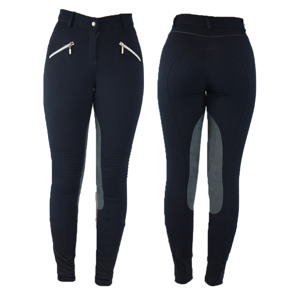 The EDT ladies Emma breeches are fashionable and practical and also designed to look great and be comfortable too. Features include: • 2 Front zip pockets •Contrast suede knee • Silver zip pocket detail •Silver stitching detail across back • Lycra bottoms.
