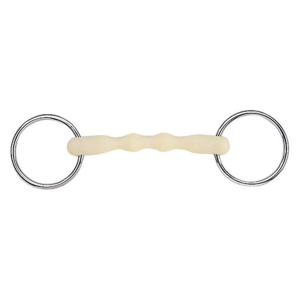 Genione Happy Mouth Bar loose ring. This gentle bit acts only on the corners of the mouth. The Happy Mouth mouthpiece makes the bit more palatable.Now with a long lasting apple scent.