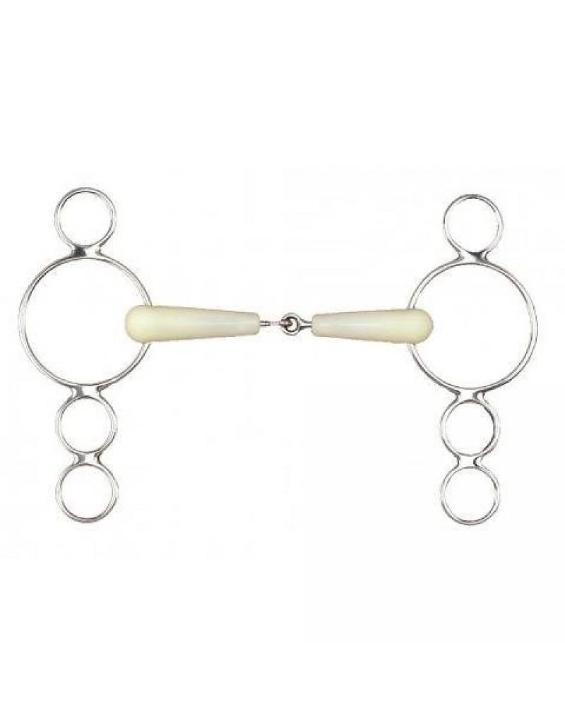 High quality plastic mouth with stainless steel, and a stainless steel core. The Happy Mouth Double Jointed Continental 3 Ring (Dutch gag) Bit is super polished and kinder to the mouth, with a great apple taste.