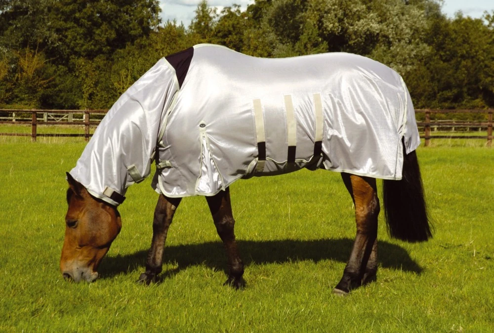 against flys and bugs. It’s features include: an adjustable and broad belly flap, an extra large gusseted tail flap, double front buckle closure and nylon lined shoulders and mane area to reduce rubbing. Extra length in the neck allows for comfortable grazing whilst the adjustable fastenings cater for all neck sizes.